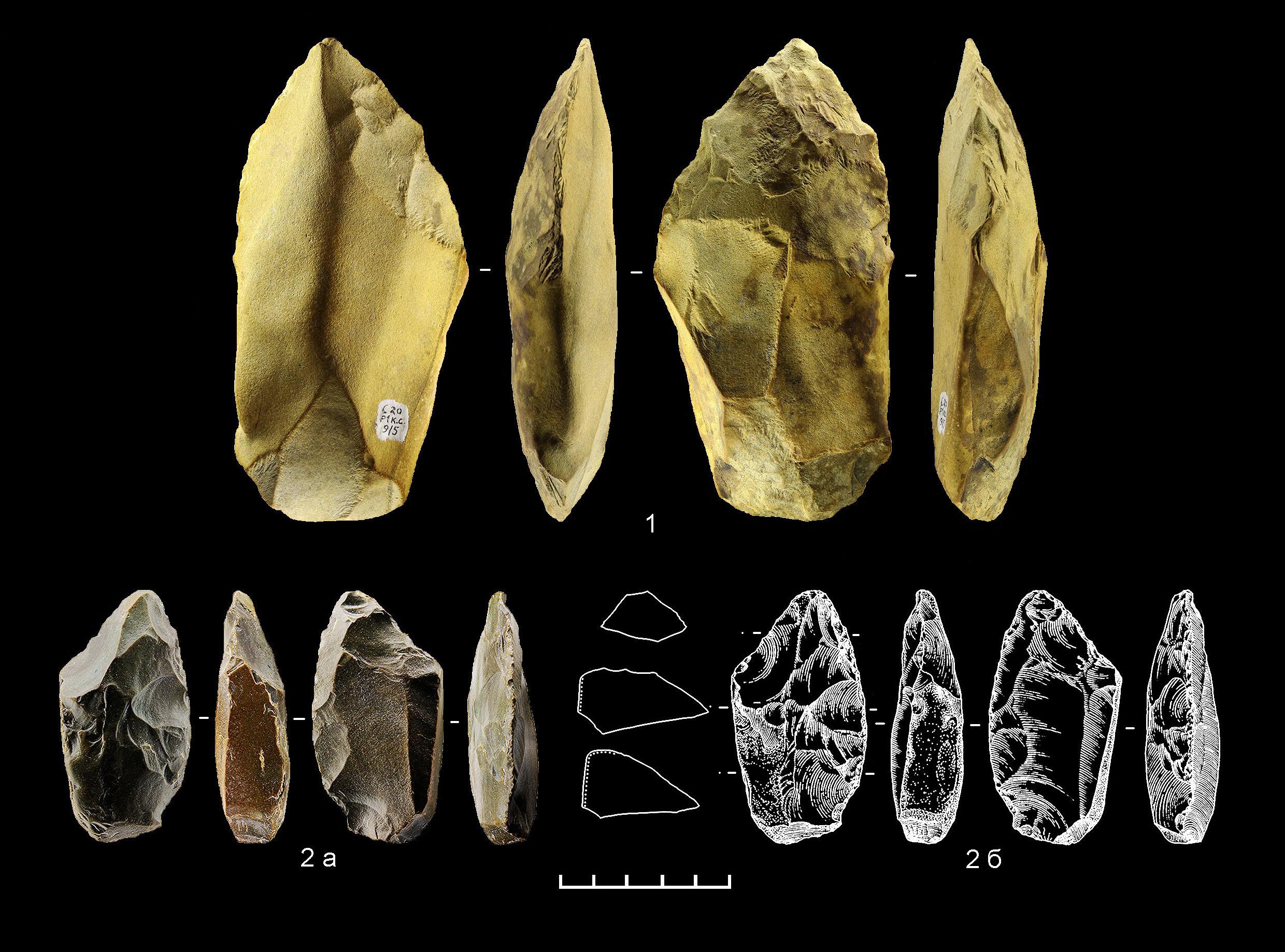 1 – листовидный двусторонне обработанный наконечник с утонченным основанием; 2а, б – асимметричный обушковый двусторонне обработанный полуторалезвийный нож.