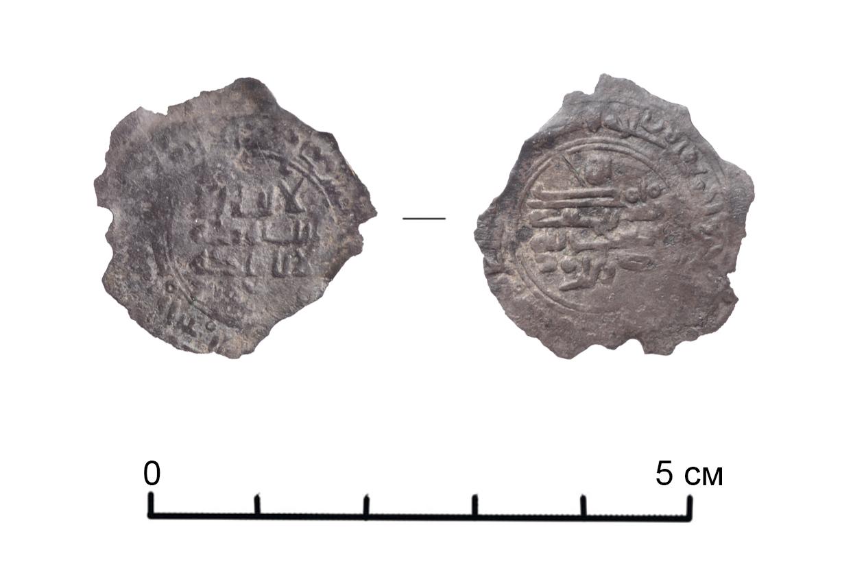 В ходе раскопок была обнаружена серебряная монета, поверхность которой после более чем тысячелетнего нахождения в культурном слое сильно окислилась. Благодаря усилиям реставратора ИИМК РАН Константина Горлова специалистам удалось не только установить первоначальный облик монеты, но и идентифицировать штемпели, которыми она была отчеканена. Детальный анализ показал, что это не оригинальная исламская монета — серебряный дирхам среднеазиатского государства Саманидов, которые в огромном количестве обращались в Восточной Европе и Скандинавии, — а подражание ему, отчеканенное не позднее середины X века.